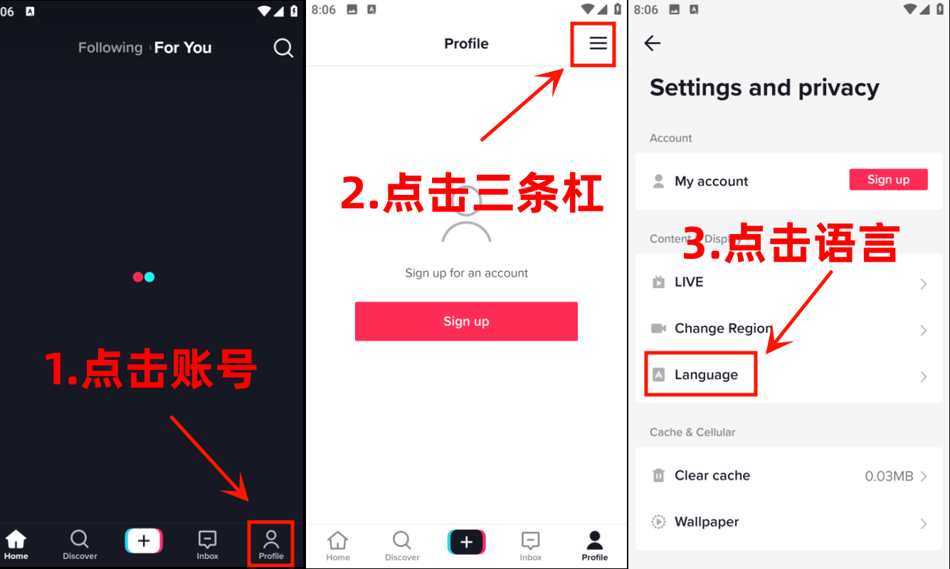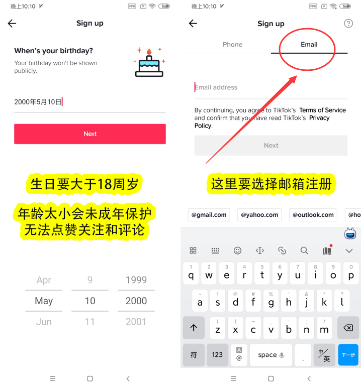 ### ==安卓手机:需要关闭定位服务(具体百度:安卓手机如何关闭定位)== ### ==建议购买付费节点注册,免费共享节点大概率无法注册== ## 一、注册方法(1) <div class="mrdoc-fragment" data-fragid=1>[片段]虎娃官网</div> ==注意:注册账号需要开启虎娃云加速== ==注意:注册账号需要开启虎娃云加速== ==注意:注册账号需要开启虎娃云加速== ### 1:在网页官网直接使用邮箱注册tiktok账号 QQ邮箱有概率会注册成功(建议尝试使用) 需要用国外的邮箱注册账号,打开这个网址 ### https://outlook.live.com/owa/ 点击创建免费账户,可以自行注册国外邮箱 ### 2:在Tik Tok软件内使用邮箱注册 ### ==使用QQ邮箱注册== ### 连接加速器,使用国外的网络(别使用香港节点),打开tiktok软件,点击注册,然后使用邮箱注册  ### 3.选择生日的时候,一定要选择大于18岁的,年龄选择的过小,会有未成年保护账号注册成功以后也会有一个锁定状态,而且无法点赞评论的。 #### ==使用刚才注册的outlook邮箱注册账号==  ### 4.设置密码:这一步需要8位以上 包含字母+数字+特殊字符(!@#$%^&这种就是特殊字符)举例:aB123456@  设置用户名 注意用户名不能重复 如果出现如图中的超时,点击左上角直接跳过即可。 注册成功后如果不能登录 那就晚点再登录 别太频繁一定可以登录的!! ## 二、注册方法(2) ### 打开下面网页tiktok注册账号 ### 使用安卓自带浏览器,或者使用谷歌浏览器注册 ==连接虎娃云加速器app后打开(别使用香港节点) 节点选择:可手动选择台湾、日本等节点== ## https://www.tiktok.com/profile?lang=zh-Hant-TW ### ====打开网页需要开启加速器再打开== ### 此方法只针对本教程推荐的订阅有效,用其他订阅或 VPN 的请略过。无需接收验证码即可注册成功。由于是个人创建的独立邮局,资源有限,请勿随意传播。 ### ==特别提醒 :新注册账号 24小时内禁止点赞、收藏、关注。== ### 24小时养号期过后,严禁在Tk评论区内评论留言,转发视频,严禁上传作品。在养号期间可以下载素材。禁止使用==【大陆,香港,印度】节点!== ## 三、tiktok如何切换其它国家 ### 1、更改成中文语言 点击Prefile(账号) 点击Language(语言) 可以把语言切换中文简体   ### 2、更改其它国家 点击个人主页,选择内容偏号 里面可以切换其他国家和地区。  ## <a href="../../doc/1663/" targert="_blank">👉返回【安卓】海外版Tiktok免拔卡教程</a> ## <a href="../../p/tiktok/" targert="_blank">👉返回教程首页目录</a>